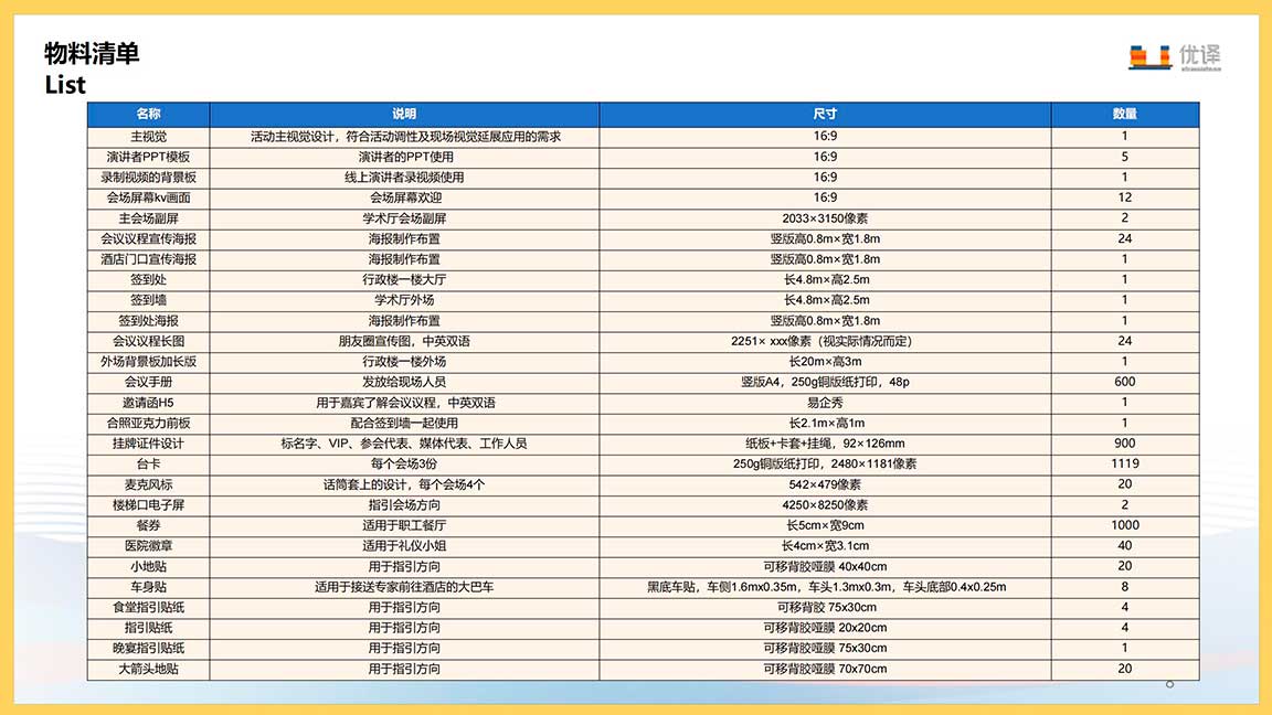我们会根据会议场地进行实地考量,提供场地所需的物料(包括但不限于LED大屏、会议主视觉设计、衍生设计、会议水牌、大中小型背景板、会议手册以及 会议桌椅、地毯等等由大到小的各类型物料) 我们会在客户的基本需求上提供更加全面的建议。提高会议价值以及突出会议特点。