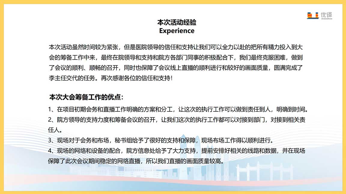 会前我们会进行沟通会,将双方需求进行沟通。并且安排对接专员进行整个会议的前后对接。并在项目确定的时候成立项目小组。其中包括会务组、摄影组、技术组、翻译组,不同组别之间各司其职。根据项目的需求进行安排。